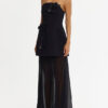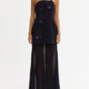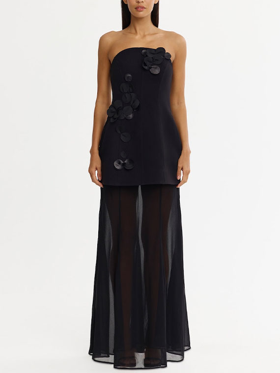 Command attention at any event with the Ashgill Maxi Dress in Black, a study in architectural contrast and refined texture. The silhouette marries a sculpted bonded crepe bodice with a detachable sheer georgette maxi skirt, creating fluid movement and dramatic allure. Dimensional 3D appliqués add couture-inspired detail, while the addition of the detachable skirt allows for versatile bridal or occasion dressing.