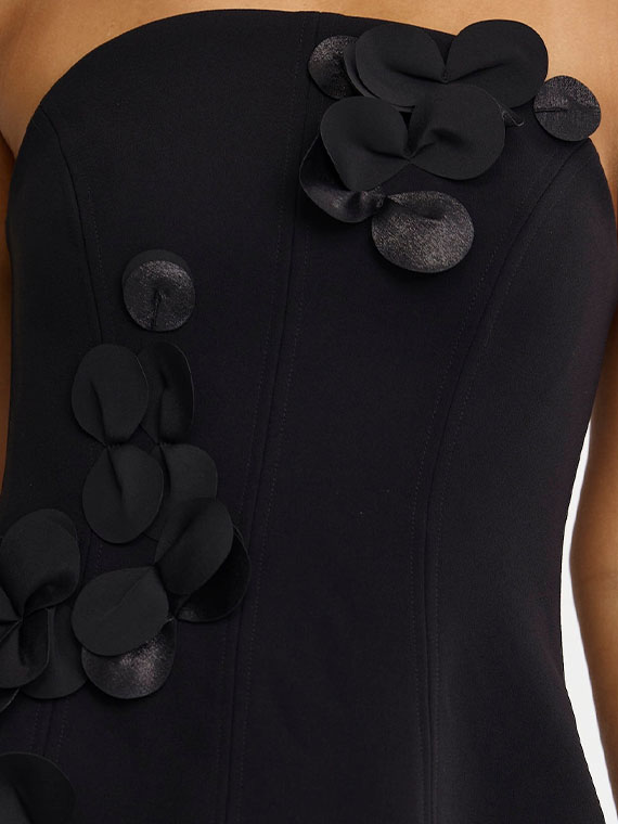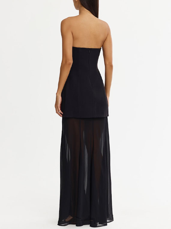 Command attention at any event with the Ashgill Maxi Dress in Black, a study in architectural contrast and refined texture. The silhouette marries a sculpted bonded crepe bodice with a detachable sheer georgette maxi skirt, creating fluid movement and dramatic allure. Dimensional 3D appliqués add couture-inspired detail, while the addition of the detachable skirt allows for versatile bridal or occasion dressing.