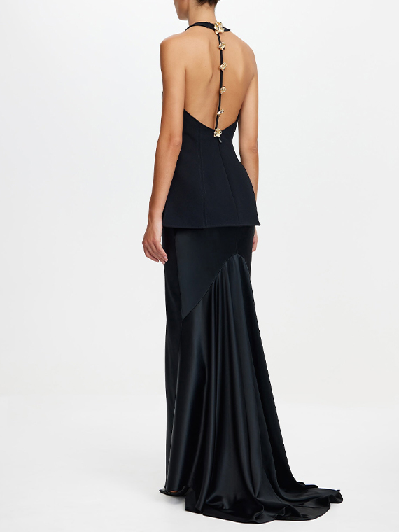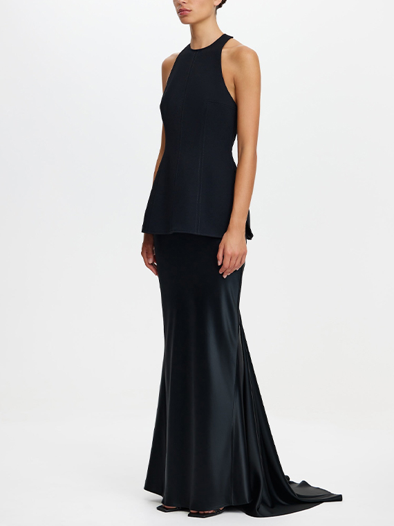 Introducing the Hawick Top in Black, a sleek silhouette designed for elevated, versatile styling. Featuring a high neckline and flared hem with side splits, this bonded top is fitted through the bodice and detailed with tonal hardware at the back. Perfect for pairing with trousers or long skirts, it offers modern minimalism.