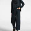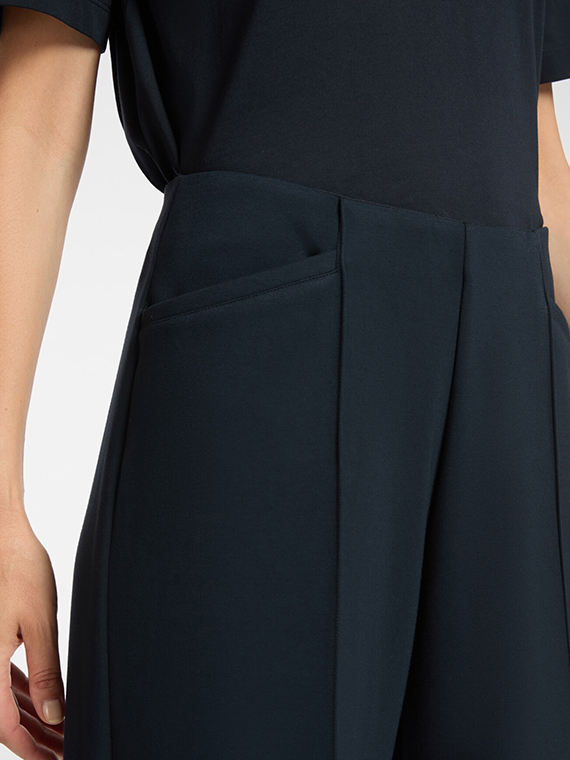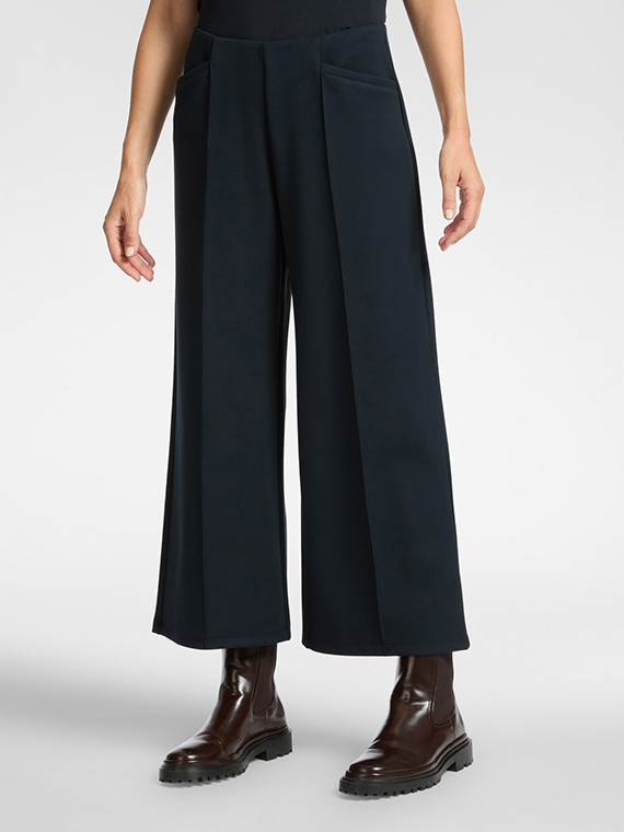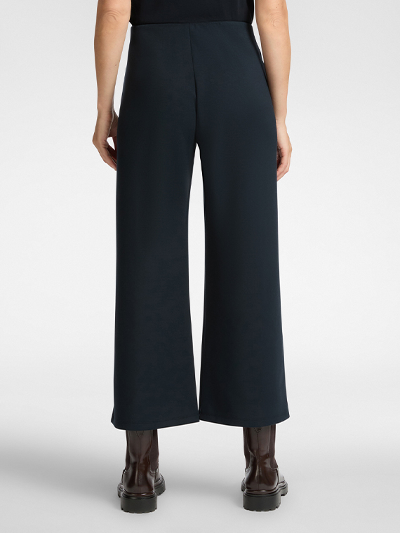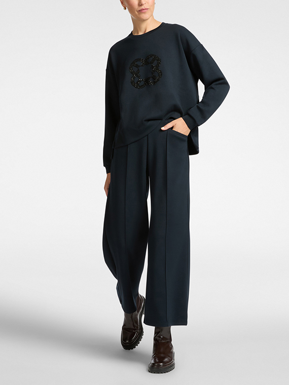 Lightweight scuba pull-on cropped trousers. The elasticated waist allows for a comfortable fit, ensuring maximum comfort. The convenient pockets make it a “sporty chic” garment to combine with t-shirts in the same fabric.