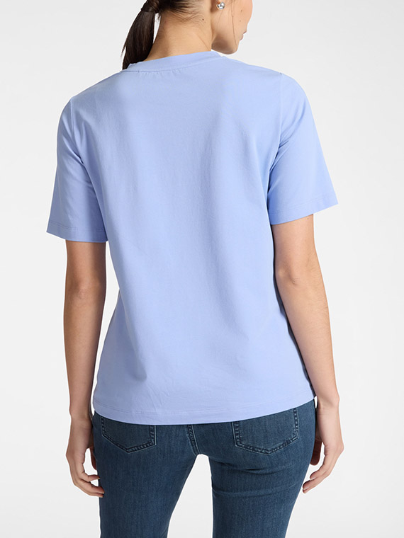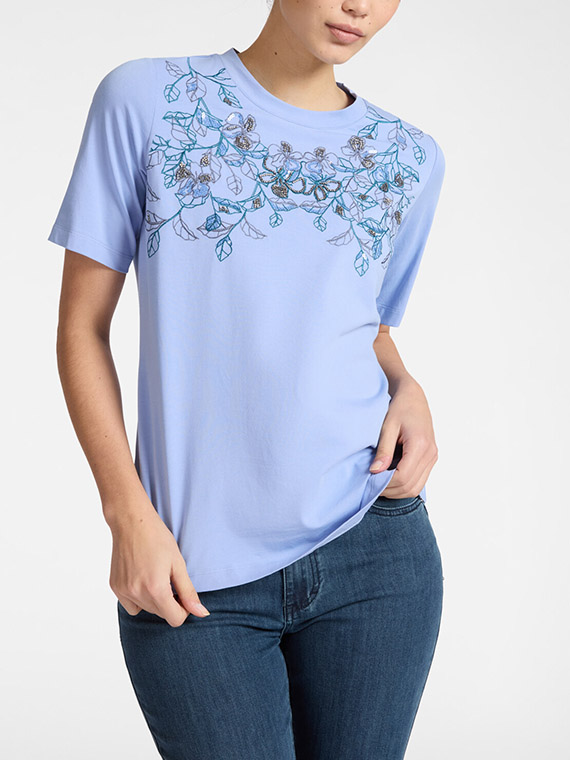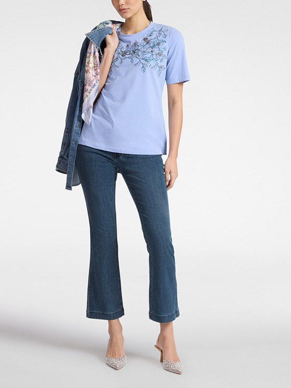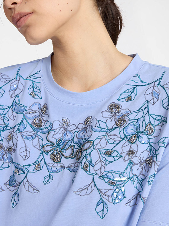 Cotton jersey T-shirt with precious floral embroidery on the front in thread and crystals. Ideal for a contemporary style.