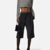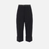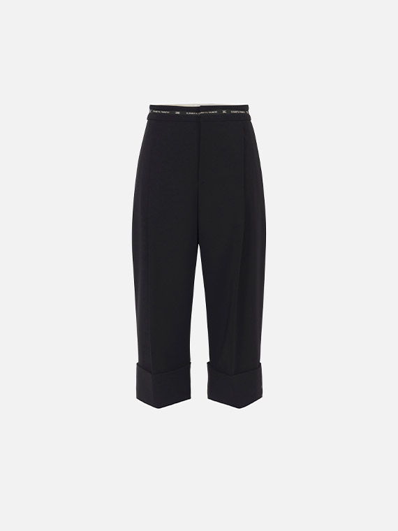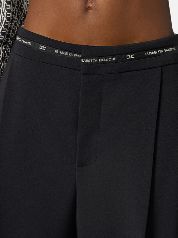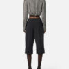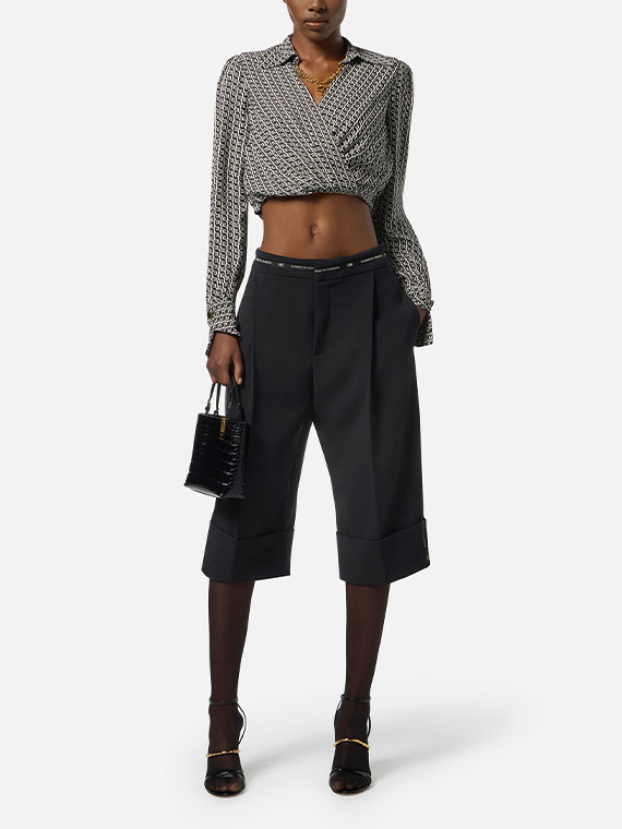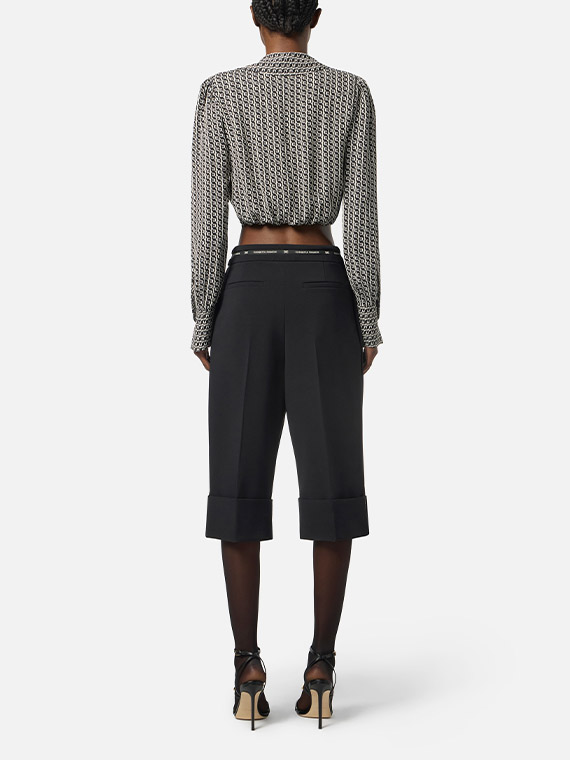 Bermuda shorts in lightweight crêpe fabric with regular fit. The stylish detail is the ribbon at the waist inspired by men’s tailoring placed on the outside of the garment with a contrasting logo. The length is below the knee with turn-ups at the hemline.