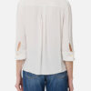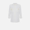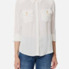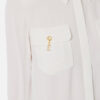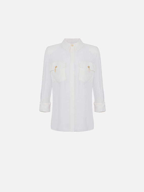 Blouse in viscose georgette fabric with compact weave. The garment has a classic collar, ¾ sleeves and flap pockets. The focus is on the jewel details: the visible enamelled button, the dangling cufflinks with chain and those on the cuffs illuminate the garment with multiple precious touches. Slim fit.