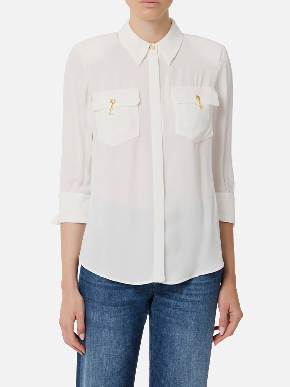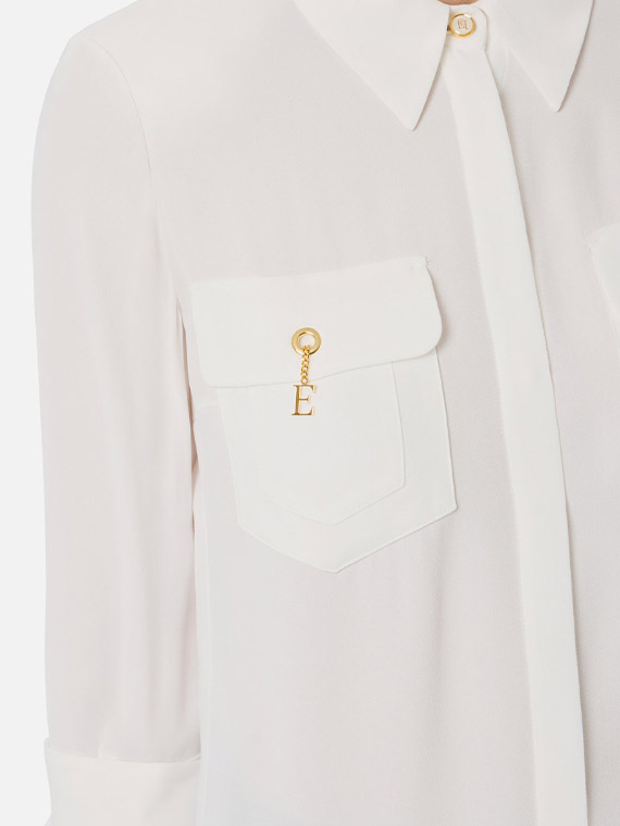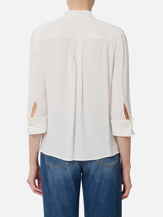 Blouse in viscose georgette fabric with compact weave. The garment has a classic collar, ¾ sleeves and flap pockets. The focus is on the jewel details: the visible enamelled button, the dangling cufflinks with chain and those on the cuffs illuminate the garment with multiple precious touches. Slim fit.