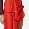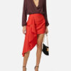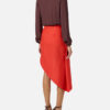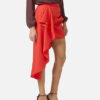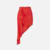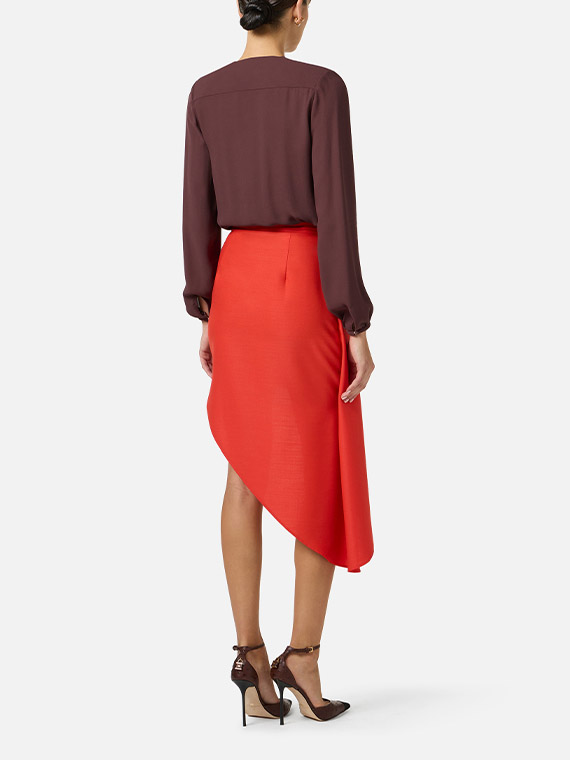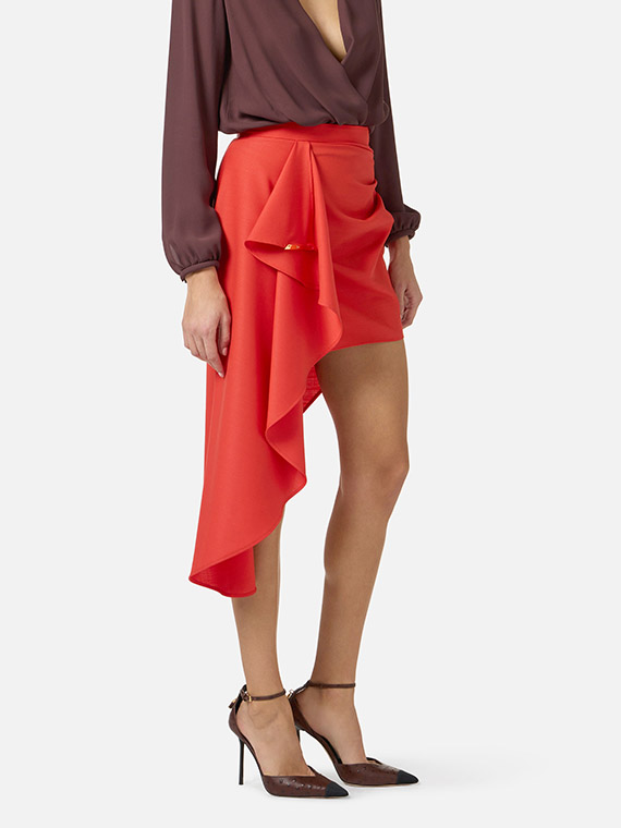 Cool wool skirt. It stands out for its asymmetrical cut and side draping, which creates a hypnotic movement. Embellished with a golden metal logo plaque and geometric cut. Slim fit.