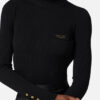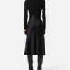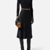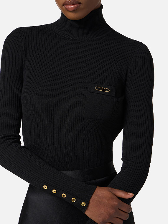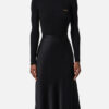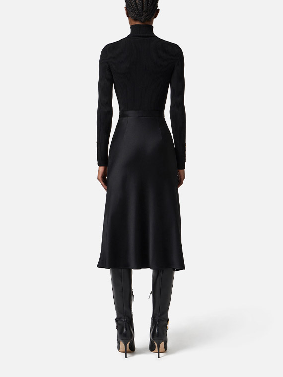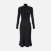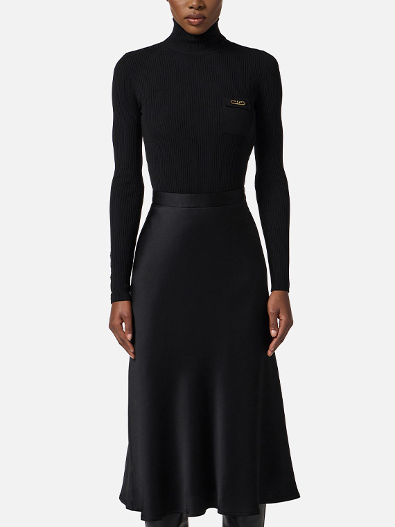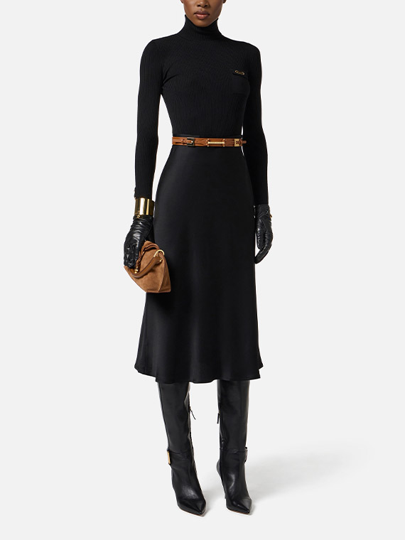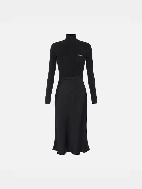 Dress in knit fabric with slim fit. The turtleneck dress features long sleeves and a silk calf-length skirt flared at the bottom, for a sophisticated contrast of textures. The ribbed knitting gives a defined weave. The garment is finished by a silk breast pocket with golden metal logo.