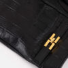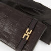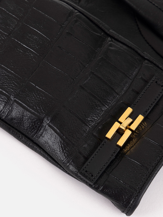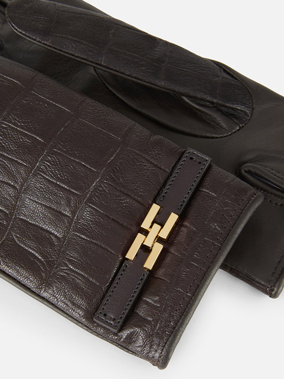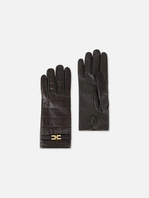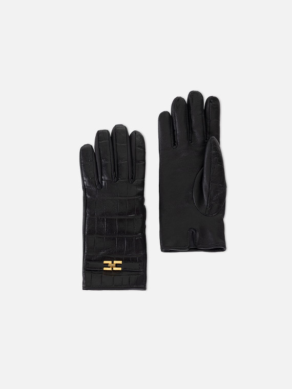 Nappa leather gloves defined by crocodile print texture. With a feminine enveloping design on the hand, they have wool lining and are embellished with a strip with golden metal logo on the wrist. Length 22 cm