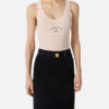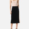 Cool wool skirt. It stands out for its asymmetrical cut and side draping, which creates a hypnotic movement. Embellished with a golden metal logo plaque and geometric cut. Slim fit.