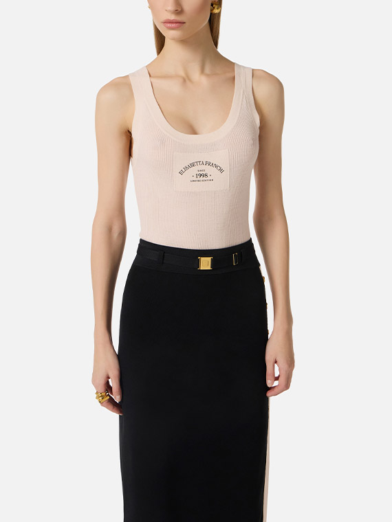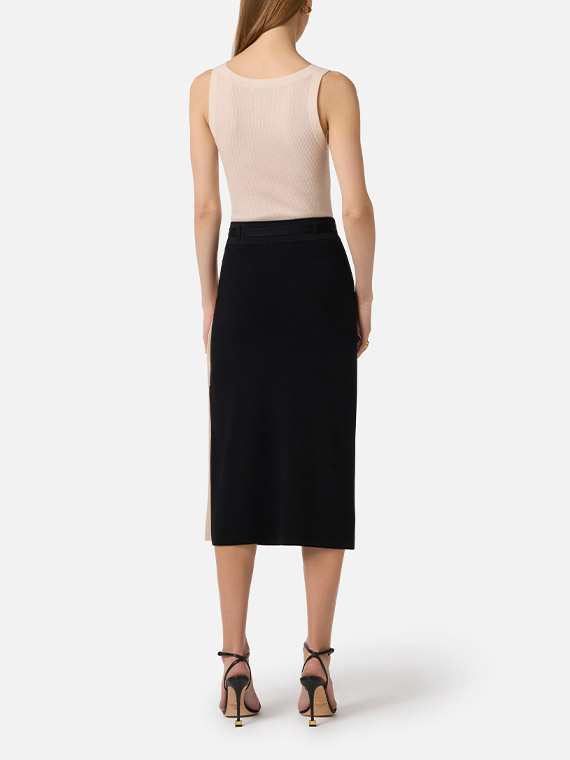 Cool wool skirt. It stands out for its asymmetrical cut and side draping, which creates a hypnotic movement. Embellished with a golden metal logo plaque and geometric cut. Slim fit.