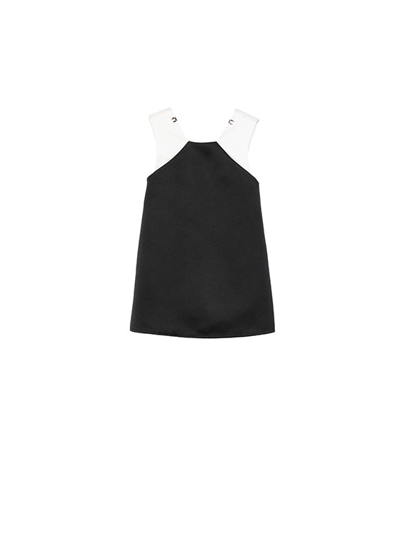 Bow at the back. Sleeveless. V-neck. A-line. Embellishment at the straps.