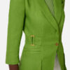 Single-breasted jacket in a linen blend with a flowing, shiny texture. The blazer features peak lapels and ¾ length sleeves. It stands out for its design with cuts and overlaps that recreate the effect of a peplum insert. The side straps are embellished with golden metal rings and buttons. Regular fit.