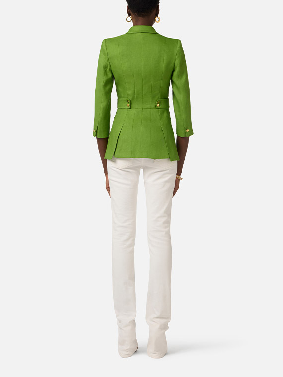 Single-breasted jacket in a linen blend with a flowing, shiny texture. The blazer features peak lapels and ¾ length sleeves. It stands out for its design with cuts and overlaps that recreate the effect of a peplum insert. The side straps are embellished with golden metal rings and buttons. Regular fit.