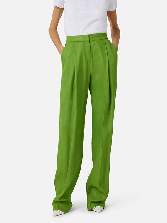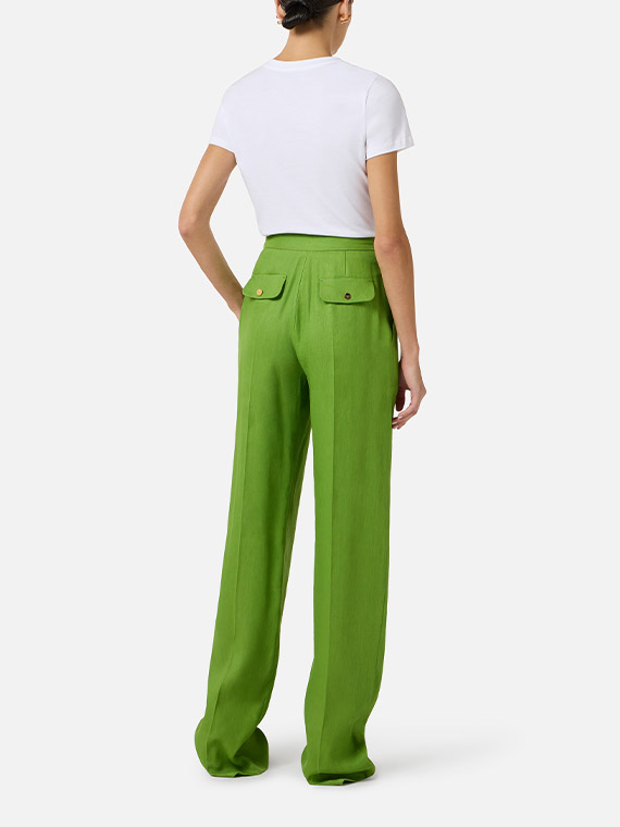 Trousers in a linen blend with a flowing, shiny texture. They feature an iron crease in the centre, slant pockets and flaps applied on the back, embellished with golden metal buttons with the logo. Regular fit.