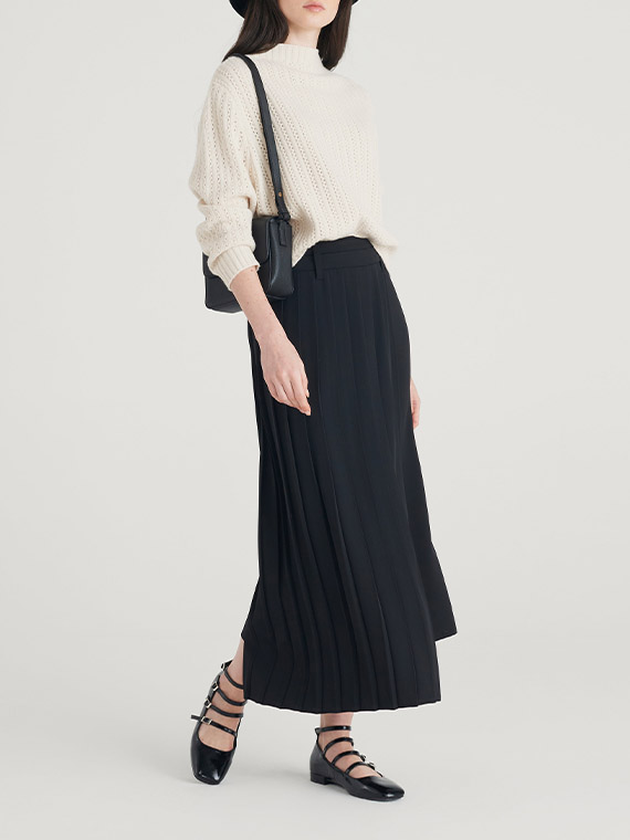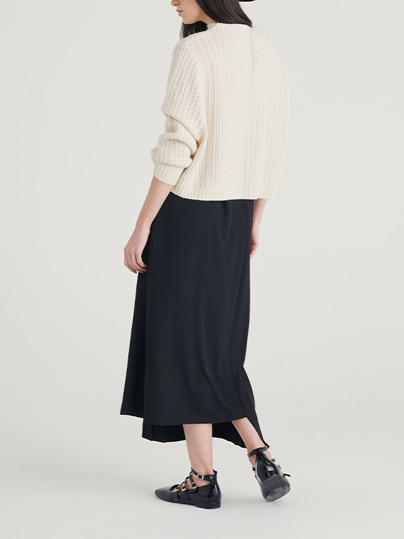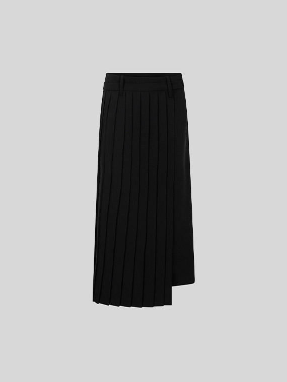 This pleated crepe skirt stands out for its asymmetrical line, adding a modern and dynamic touch. The light and flowing fabric enhances movement, while the waistband elegantly defines the silhouette. Perfect for those seeking a balance between sophisticated style and everyday comfort.