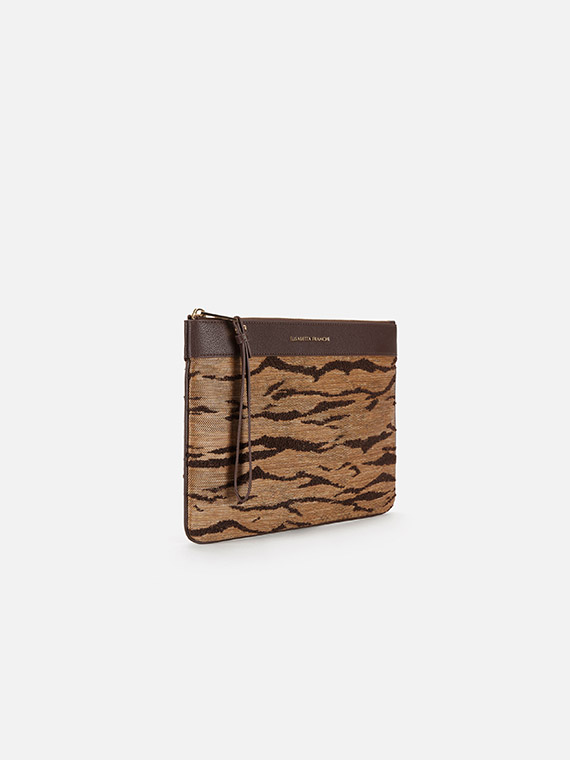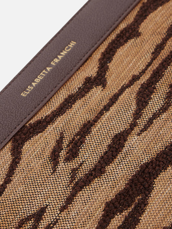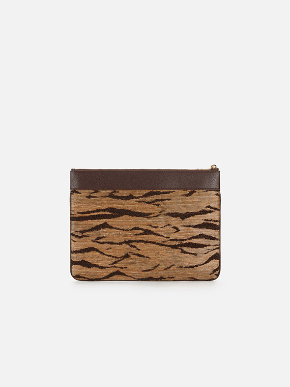 Pouch made in raffia-effect fabric. The star feature is the tiger all-over print, inspired by natural shapes and colours. Zip closure. Size: 21 X 30 X 1 cm