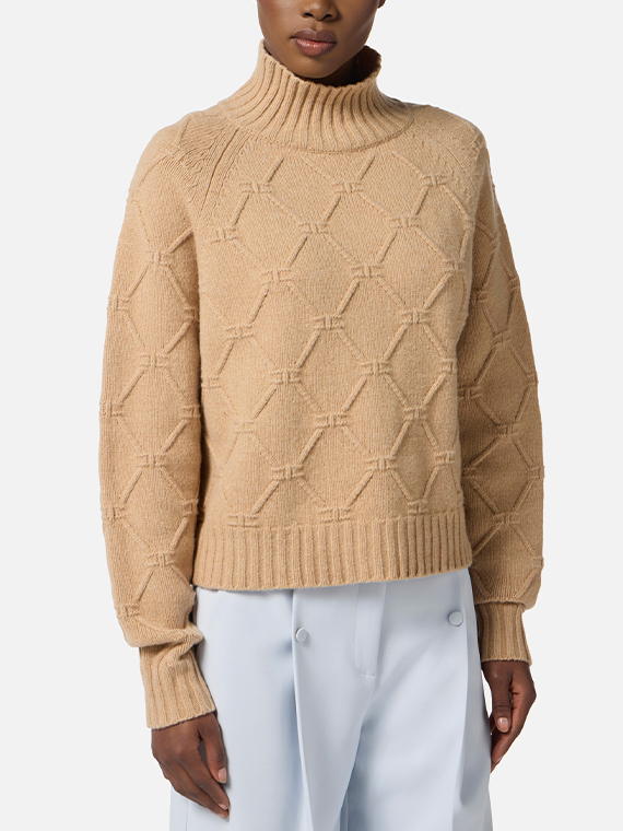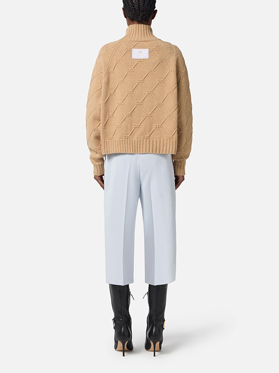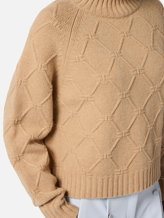 Boxy knit pullover with an oversized fit. The garment has a high collar, long sleeves and ribbed hem. It stands out for the jacquard diamond pattern, giving three-dimensionality and compactness to the texture. The label with logo on the back of the neck completes the garment.