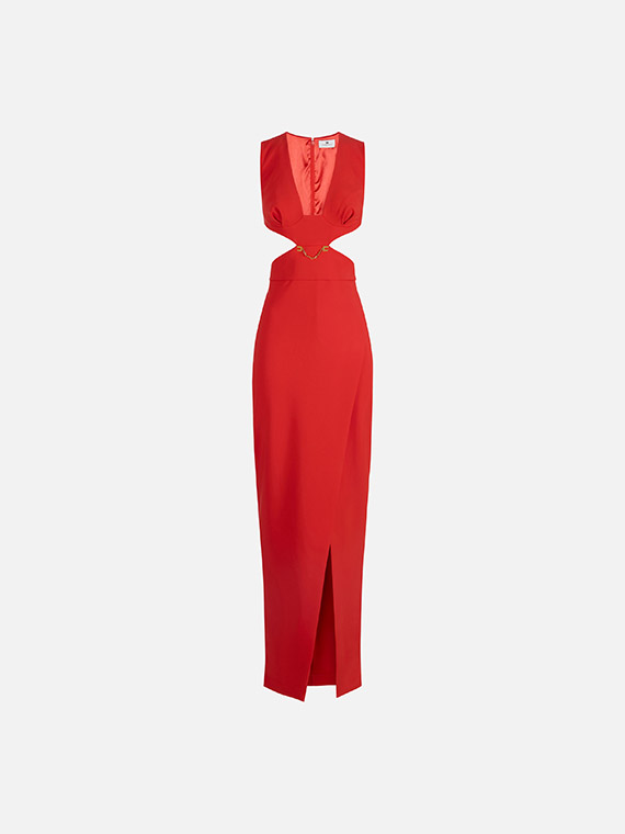 Evening dress in lightweight crêpe fabric. This sleeveless dress features a shaped neckline and stands out for the cut-outs that frame the hips. The side slit on the skirt gives a bold and decisive silhouette. Precious reflections with logo detail and chain on the bust. Slim fit.
