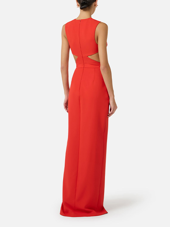 Evening dress in lightweight crêpe fabric. This sleeveless dress features a shaped neckline and stands out for the cut-outs that frame the hips. The side slit on the skirt gives a bold and decisive silhouette. Precious reflections with logo detail and chain on the bust. Slim fit.