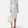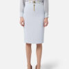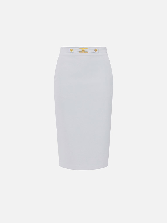 Slim fit crêpe pencil skirt. With a minimalist design, it is embellished with a jewel logo with golden metal buttons decorating the waist. Slant pockets.