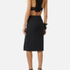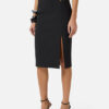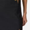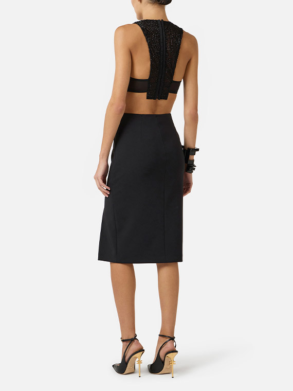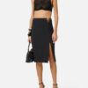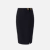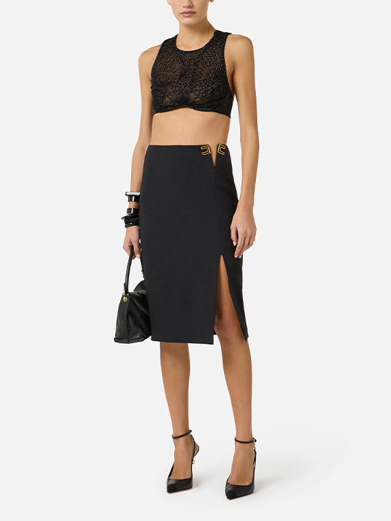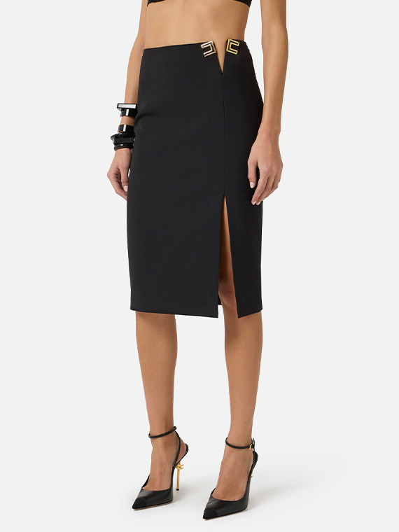 Midi skirt in double layer stretch crêpe. The waist is characterised by a V-shaped opening on one side, which opens into a side slit. It is decorated with golden metal logo details enamelled inside. Regular fit.