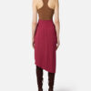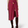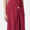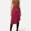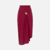 Skirt in lightweight crêpe fabric with slim fit. The asymmetrical line is enhanced by the front draping, held in place by the bright jewel logo detail. With a slit and flared bottom that give lightness and movement.