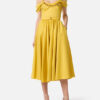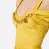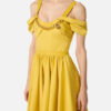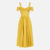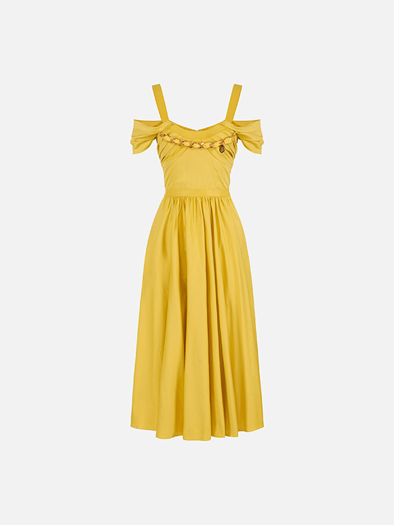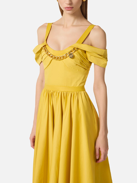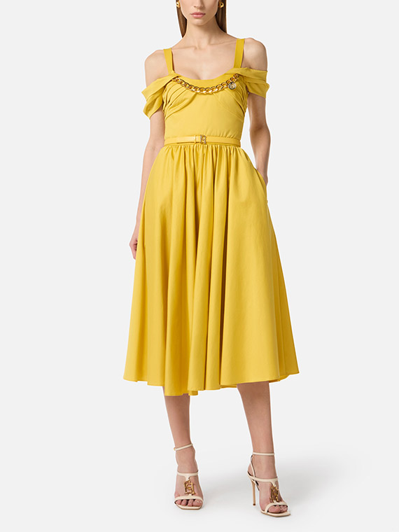 Dress in stretch cotton fabric with regular fit. The dress features straps, short sleeves and stands out for the wide circle skirt that adds movement to the refined silhouette. A touch of light is given by the removable golden metal necklace at the neckline.