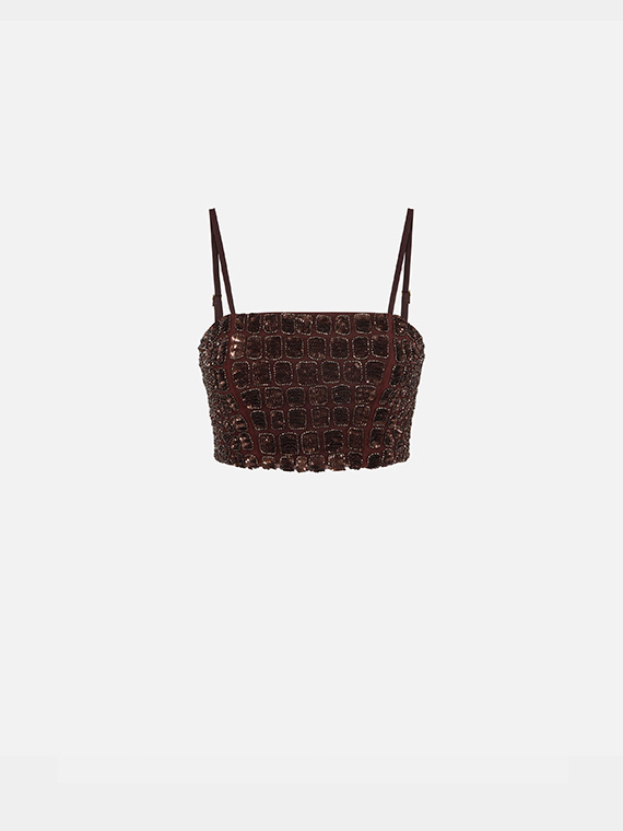 Tulle top with a slim fit. It has thin straps and is decorated with bright embroideries with crocodile-effect design, giving light and three-dimensional texture.