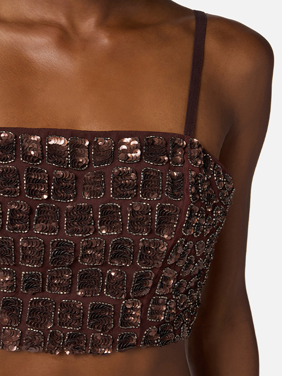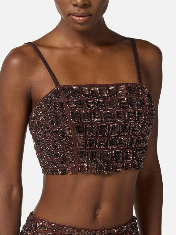 Tulle top with a slim fit. It has thin straps and is decorated with bright embroideries with crocodile-effect design, giving light and three-dimensional texture.