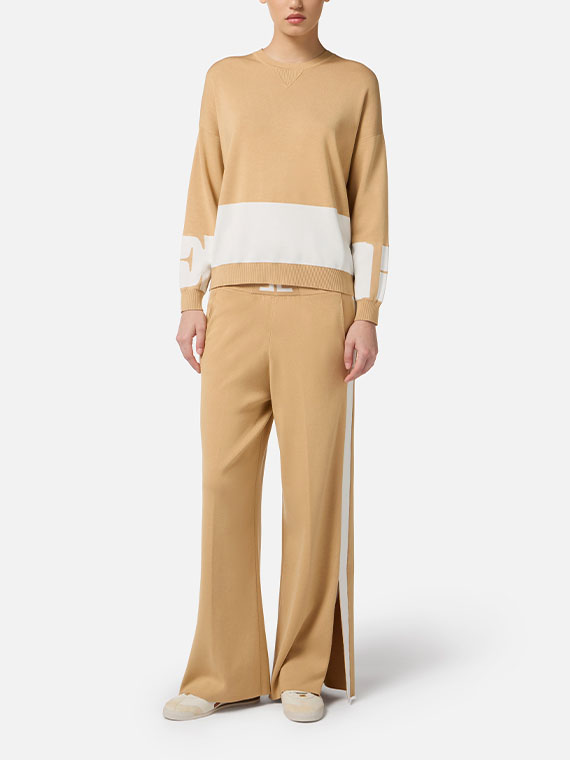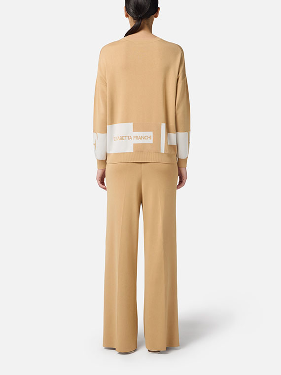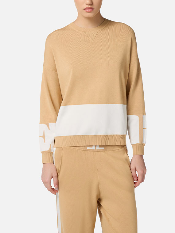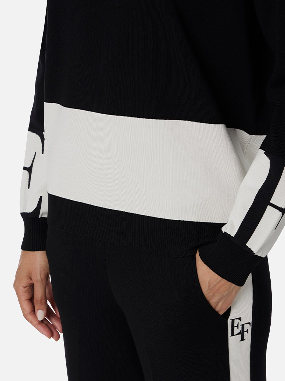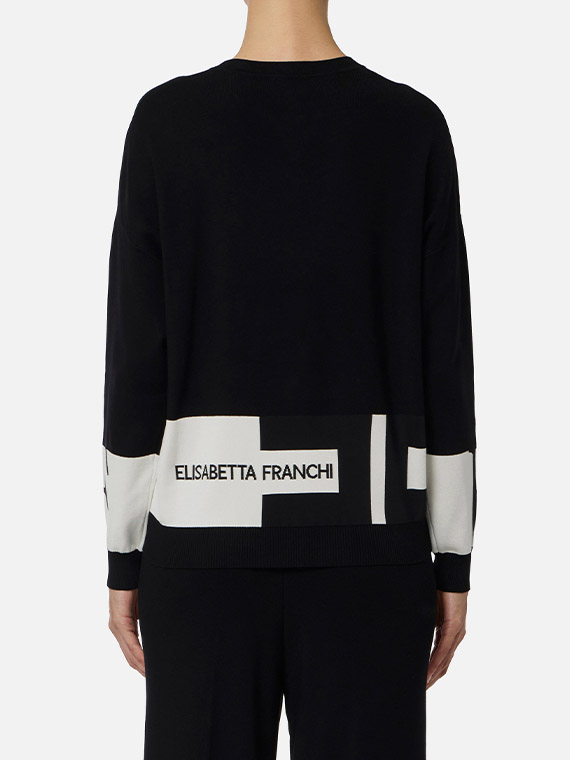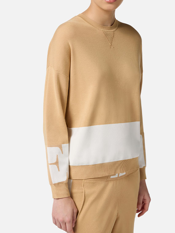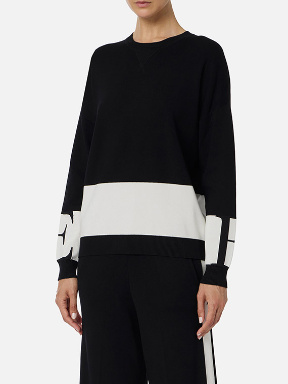 Top in viscose fabric with regular fit. With a wide crew neck, it is characterised by shiny viscose inlaid logos on the sleeves and back, creating bold colour-blocking effects.