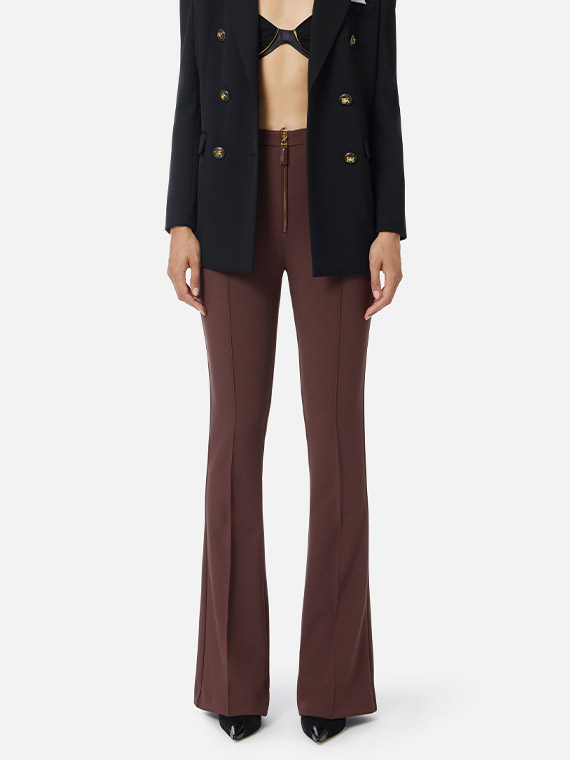 Slim fit boot cut trousers in double-layer crêpe fabric. They feature a matching front zip with pull-tab and a small bright logo detail. Part of the Essential collection, to create the perfect wardrobe.
