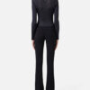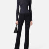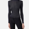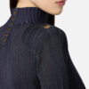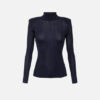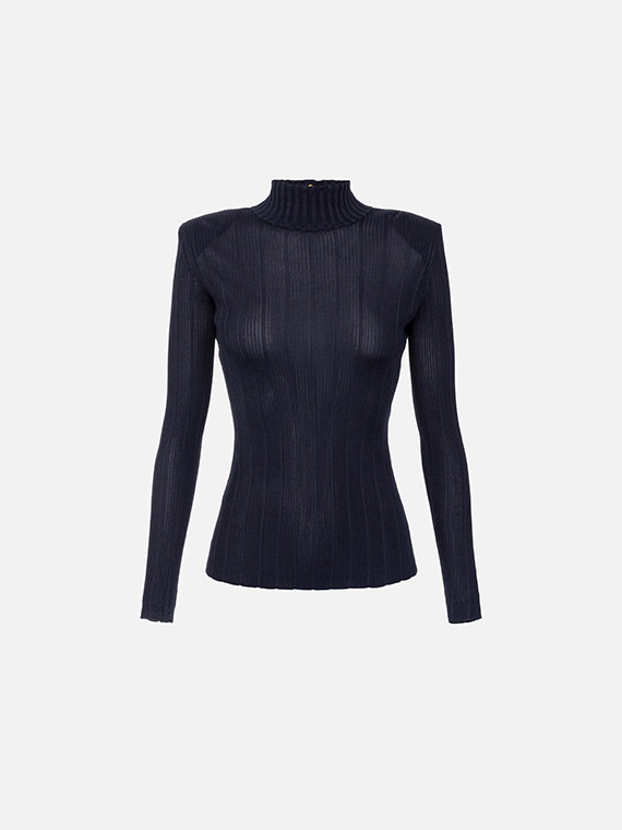 Top in viscose fabric with slim fit. With high collar and long sleeves, the shoulders are decorated with matching ribbons and golden metal logo details that add brightness. The ribbed knitting gives a dynamic texture to its flowing weave.