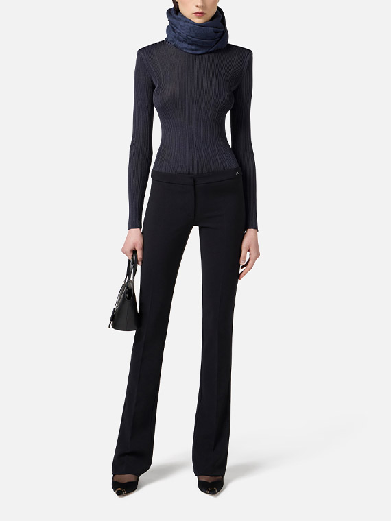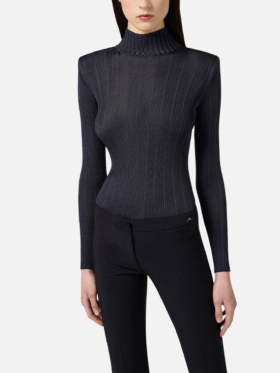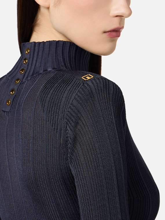 Top in viscose fabric with slim fit. With high collar and long sleeves, the shoulders are decorated with matching ribbons and golden metal logo details that add brightness. The ribbed knitting gives a dynamic texture to its flowing weave.