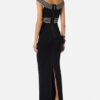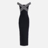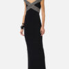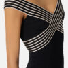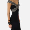 Knit long dress with a slim fit. The dress is characterised by decorative bands with contrast stripes that frame the bust. The ribbed knit and horizontal ribbing create a vibrant pattern. The back slit enhances the geometric silhouette of the garment.