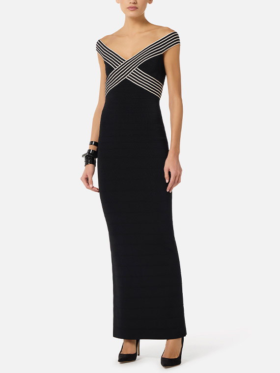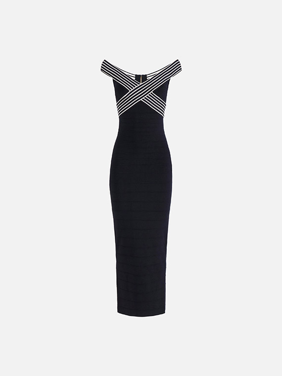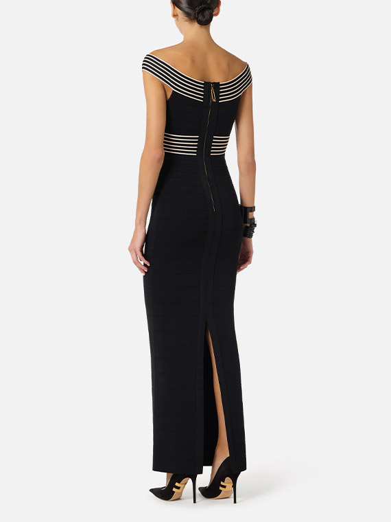 Knit long dress with a slim fit. The dress is characterised by decorative bands with contrast stripes that frame the bust. The ribbed knit and horizontal ribbing create a vibrant pattern. The back slit enhances the geometric silhouette of the garment.