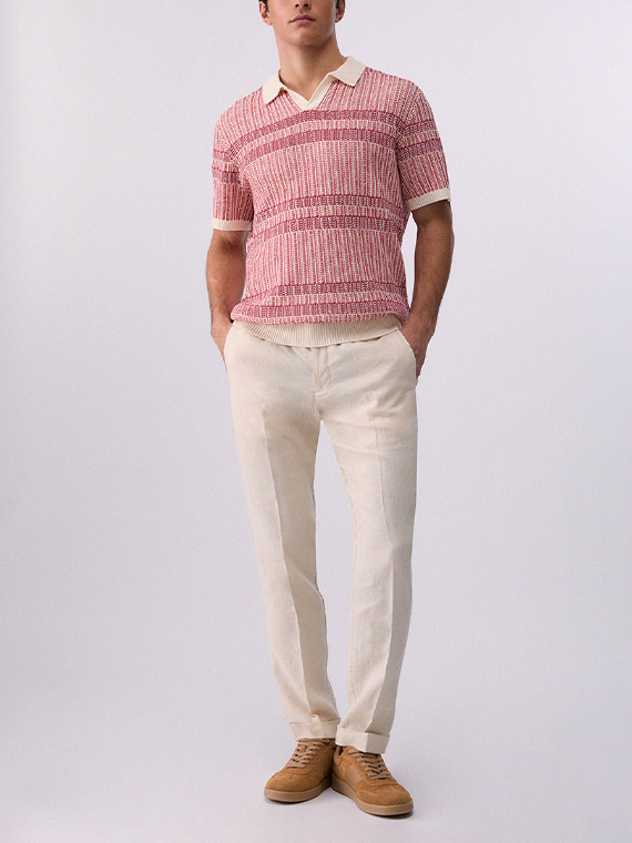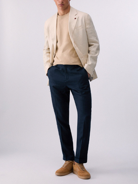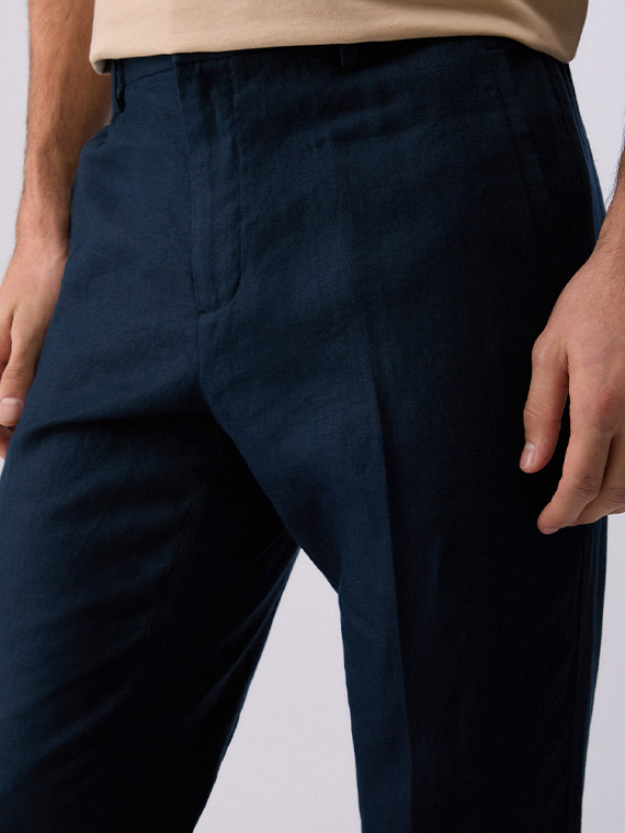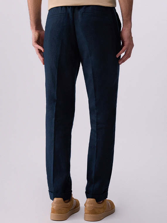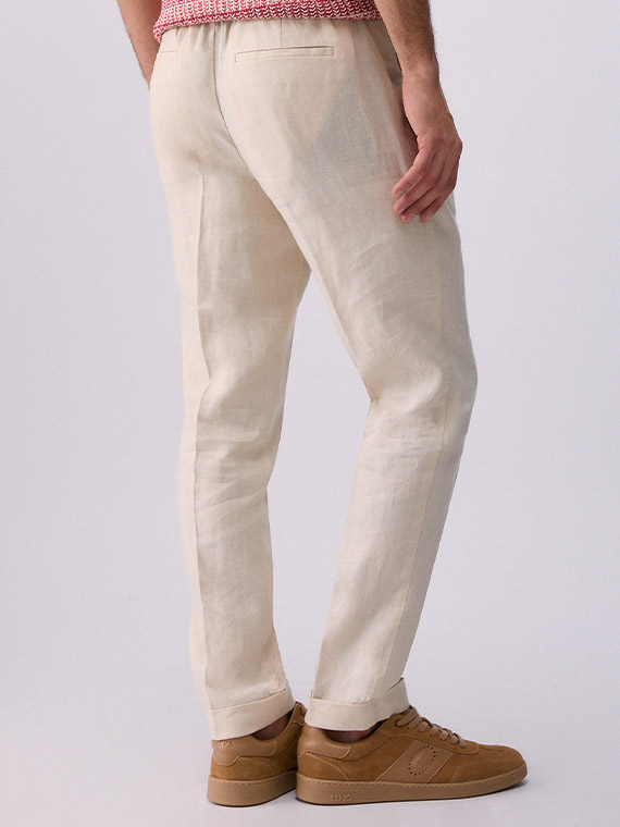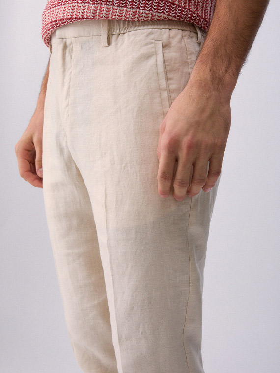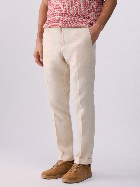 Pure linen trousers. Stretch waistband. Handy pockets. Slim fit. Turn-up hems.