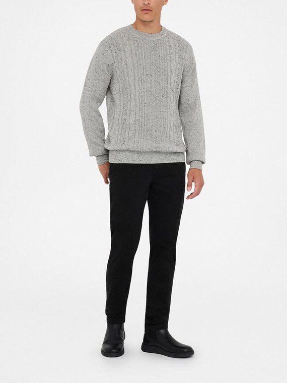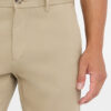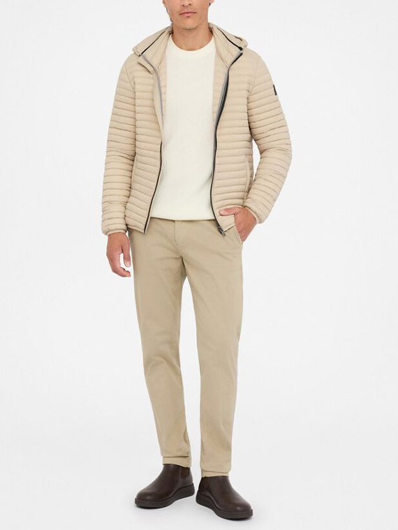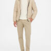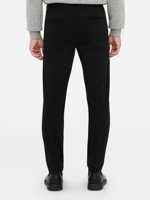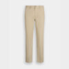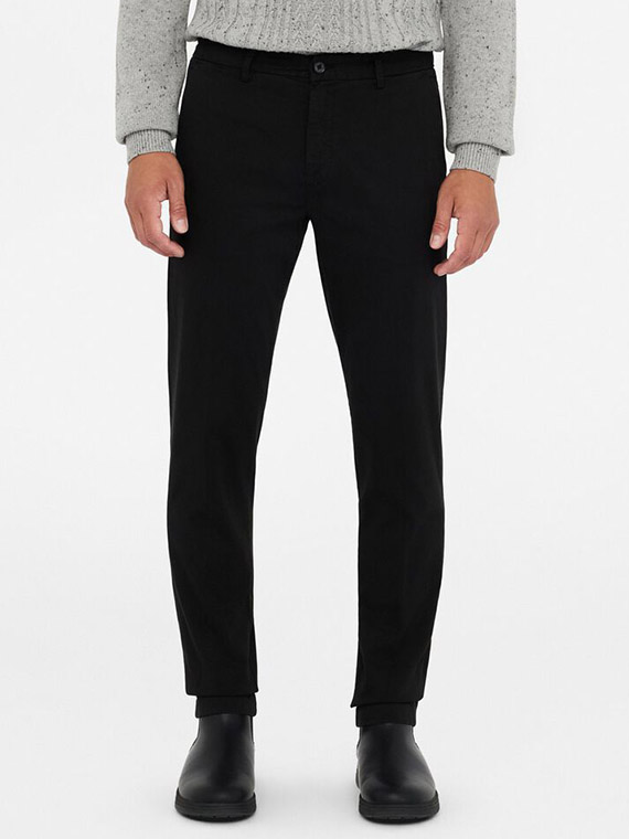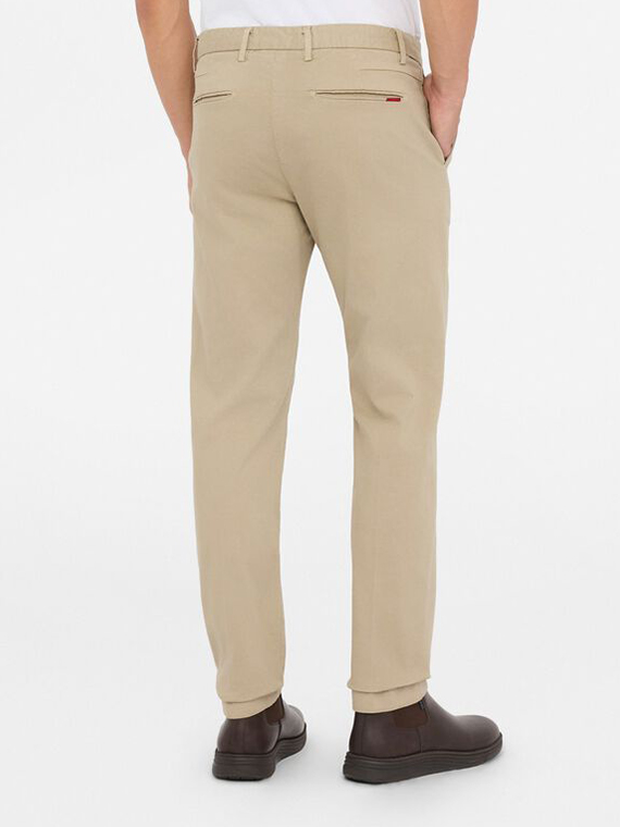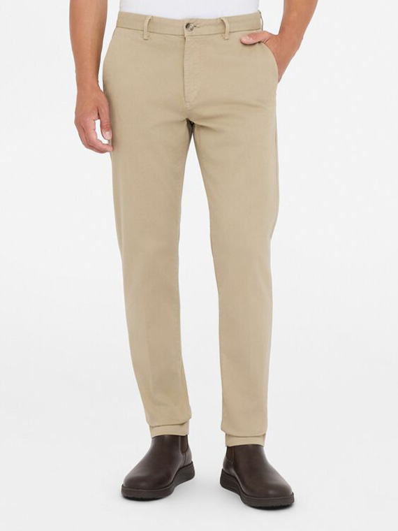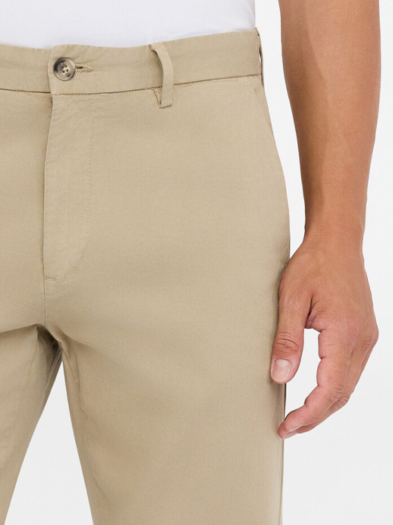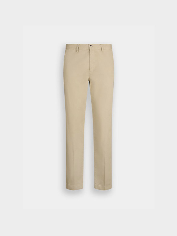 Made from stretch cotton. Ironed pleat. Pockets on the sides. Welt pockets on the back. Fly-covered zip and button closure.