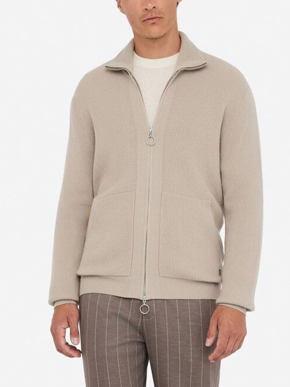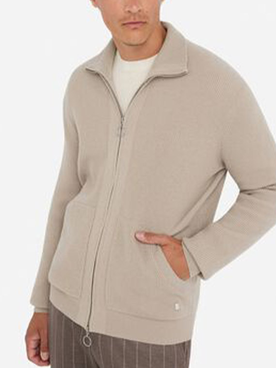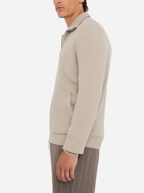 Ribbed knit. High neck. Long sleeves. Pouch pockets. Metal lj logo on the hem. Double tab zip closure.