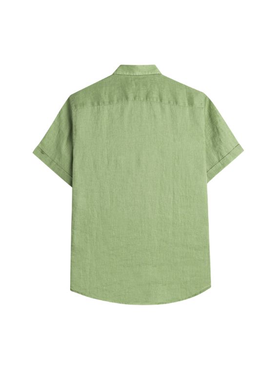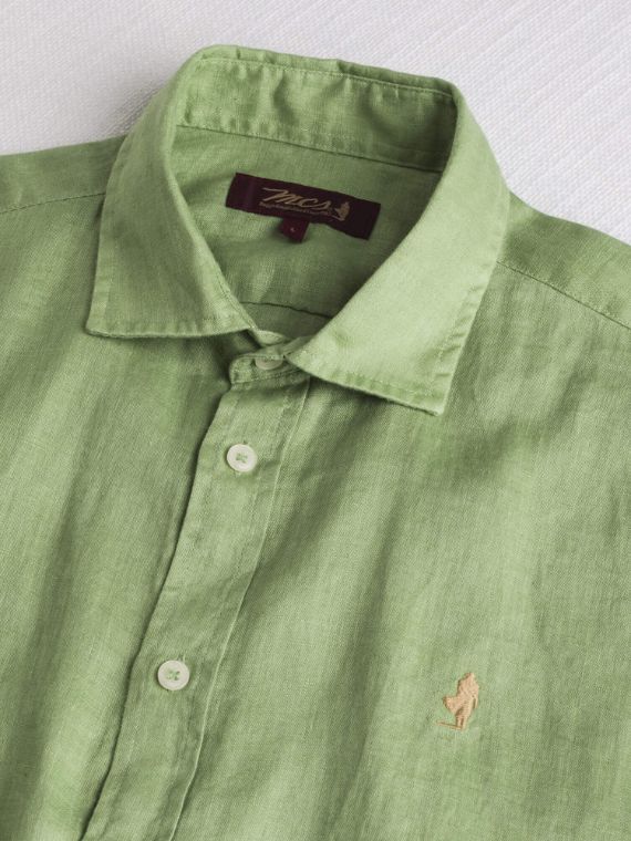 Men’s Light Green short-sleeve linen shirt made from pure piece-dyed linen, naturally cool and breathable. Ideal as a men’s short-sleeve shirt for the summer season, it combines lightness and comfort in a clean, casual style. The French collar and custom pearl buttons enhance the simple solid-color design, while the Rider MCS embroidery on the chest signs an essential and authentic model.