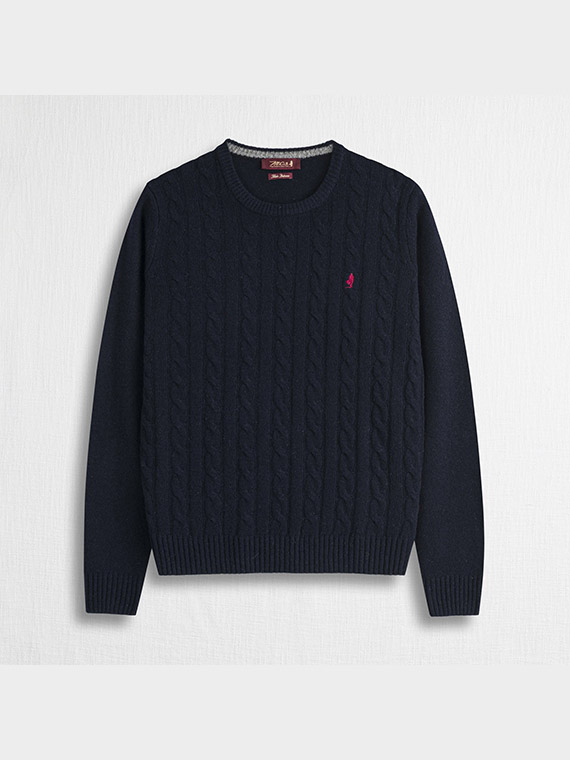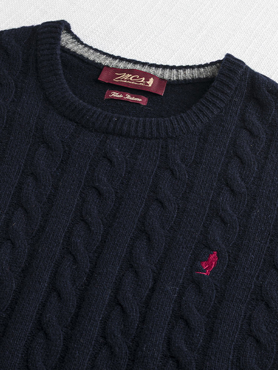 Men’s crew neck sweater in 7 gauge with cable knit, made of soft lambswool yarn. Washed with enzymes to enhance the softness of the fabric, it is finished with a Rider embroidery on the heart point and a contrasting detail inside the collar. A warm and authentic piece, ideal for facing winter with a touch of distinctive style.